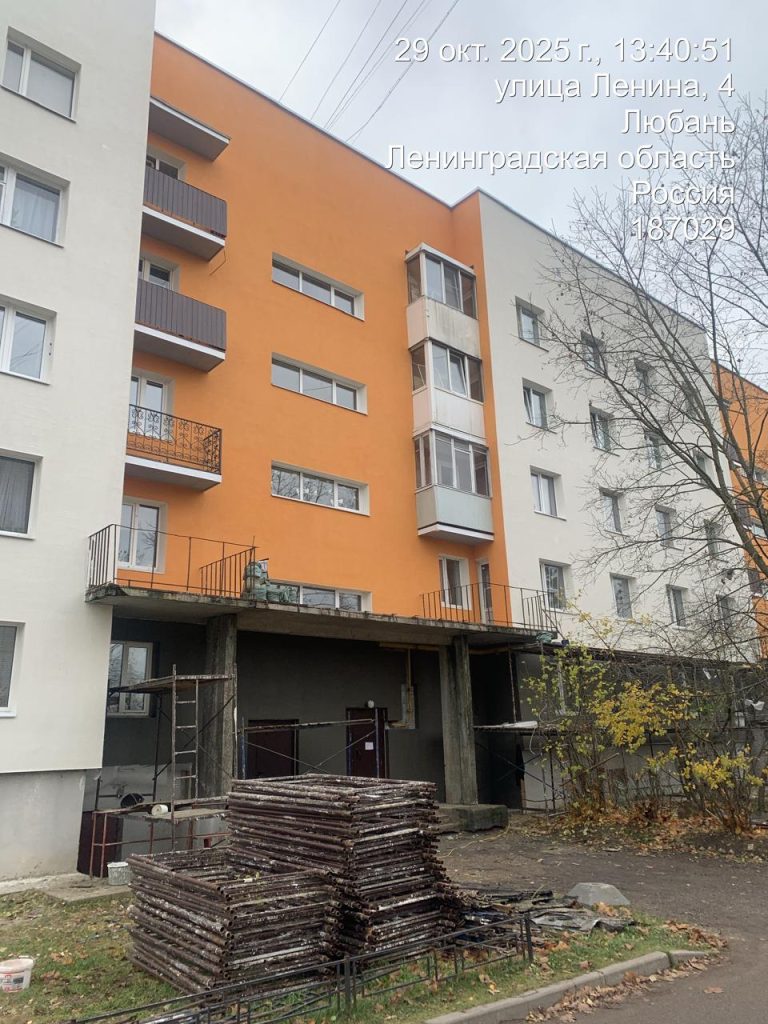 Один из объектов проверки – многоквартирный дом по адресу: Тосненский район, г. Любань, ул. Ленина, д. 4. Ремонт фасада выполняет ООО «ЛенСервисСтрой». Выполнено 82%, отставаний от графика нет.